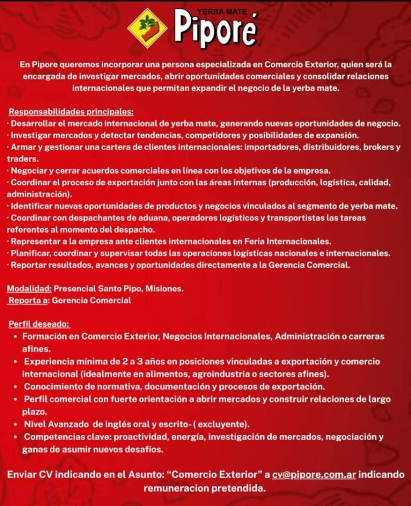 El puesto es de modalidad presencial en Santo Pipó, Misiones, y quienes estén interesados deben enviar su currículum a cv@pipore.com.ar, indicando en el asunto “Comercio Exterior” y consignando la remuneración pretendida.