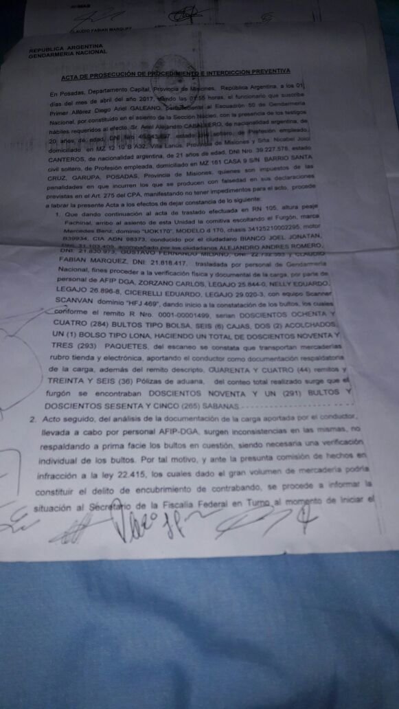 En un procedimiento realizado en conjunto por Aduanas, Afip y Gendarmería, se detuvo el 30 de marzo a una comitiva de 56 personas que viajaba en un colectivo como “escolta” de un furgón donde había 393 bultos con mercadería comprada en Paraguay y en La Placita de Posadas. Según el abogado de los integrantes del tour de compras, la mercadería cuenta con aval y es lícita. Sin embargo, la Aduana detuvo la carga que el lunes fue analizada en el escuadrón 50 de Gendarmería, en Posadas.