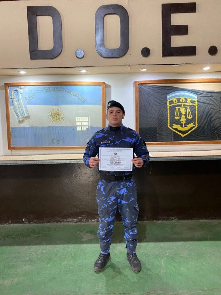 En el marco de una política institucional que promueve la formación permanente, el Oficial Ayudante Gustavo Machado, de la Dirección Infantería Oberá, se convirtió en el primer policía misionero en completar exitosamente el exigente Curso de Intervenciones Especiales dictado por la Dirección de Operaciones Especiales (D.O.E.) del Servicio Penitenciario Bonaerense. Esta capacitación, de dos semanas días, se realizó en la localidad de Los Olmos, La Plata, con la participación de 28 cursantes de distintas fuerzas del país, de los cuales solo el 50% lograron aprobarla.