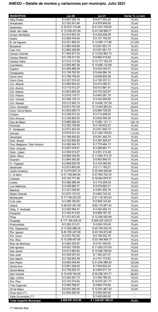 Volviendo a los datos de coparticipación municipal de julio 2021, del total de transferencia brutas a municipios, el 24,8% le correspondió a Posadas, el 6,8% a Oberá, el 5,6% a Eldorado; 3,6% a Puerto Iguazú, 3,4% a Apóstoles y el 3% a Leandro N. Alem. Entre 71 municipios se repartieron el 52,8% restante.