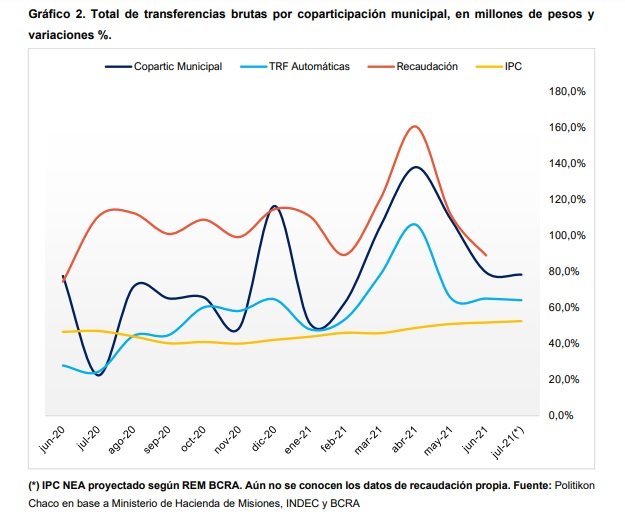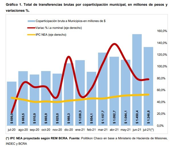 En julio 2021, las transferencias brutas a los municipios en concepto de coparticipación totalizaron $1.246,8 millones, y se incrementaron en un 78,4% a pesos corrientes respecto al mismo mes del año anterior. Si dicha evolución se la mide a moneda constante, equivale a un alza real del 16,9%. Los datos se desprenden del último informe de la consultora Politikon Chaco, con base en datos del Ministerio de Hacienda provincial.