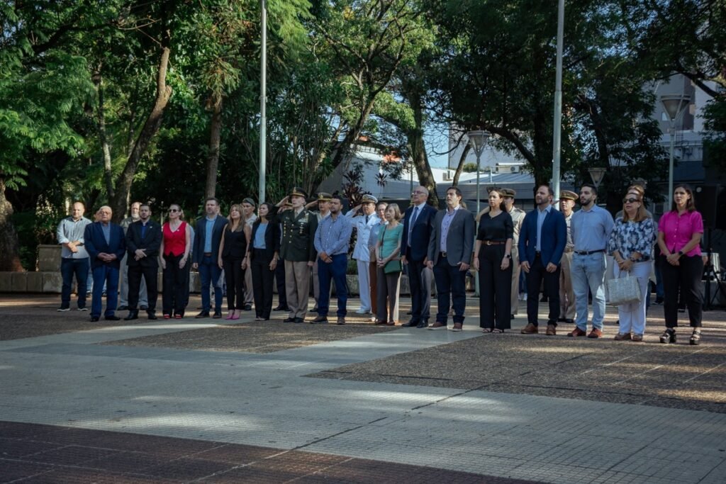 La ceremonia se llevó a cabo en la plaza homónima del microcentro de la ciudad, con la presencia de representantes del Gabinete municipal, el Comando de Brigada de Monte XII y la Asociación Sanmartiniana. En ese marco, las autoridades intervinientes depositaron una ofrenda de laureles en el busto que inmortaliza la memoria del General José de San Martín.