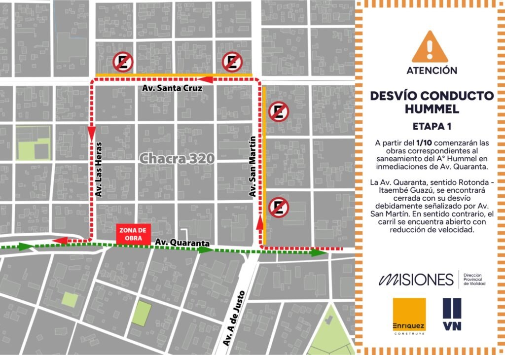 La Dirección Provincial de Vialidad informó que desde el día 2 de octubre, en Posadas, se comenzará a trabajar en las excavaciones sobre la colectora sentido este-oeste, de la Avenida Quaranta en cercanías a la intersección con la Avenida Las Heras, para poder ejecutar el saneamiento de la calle Hummel. Esta es una obra que forma parte de la construcción del Soterramiento de Av. Quaranta en intersección con Av. San Martín, que lleva adelante la empresa contratista Enríquez Construye financiada por Vialidad Nacional. Se estima que este desvío podría extenderse por 3 semanas.