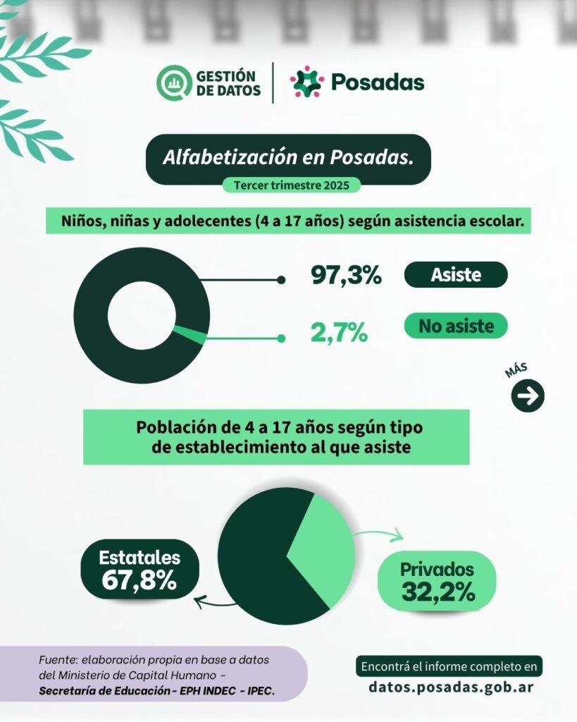 Más allá de la estructura institucional, el municipio busca traducir estos datos en una lectura más amplia sobre el perfil educativo de la ciudad. Según el relevamiento, Posadas concentra el 12,7% de todos los establecimientos educativos de Misiones, un indicador que refuerza su rol como nodo formativo dentro del territorio provincial.