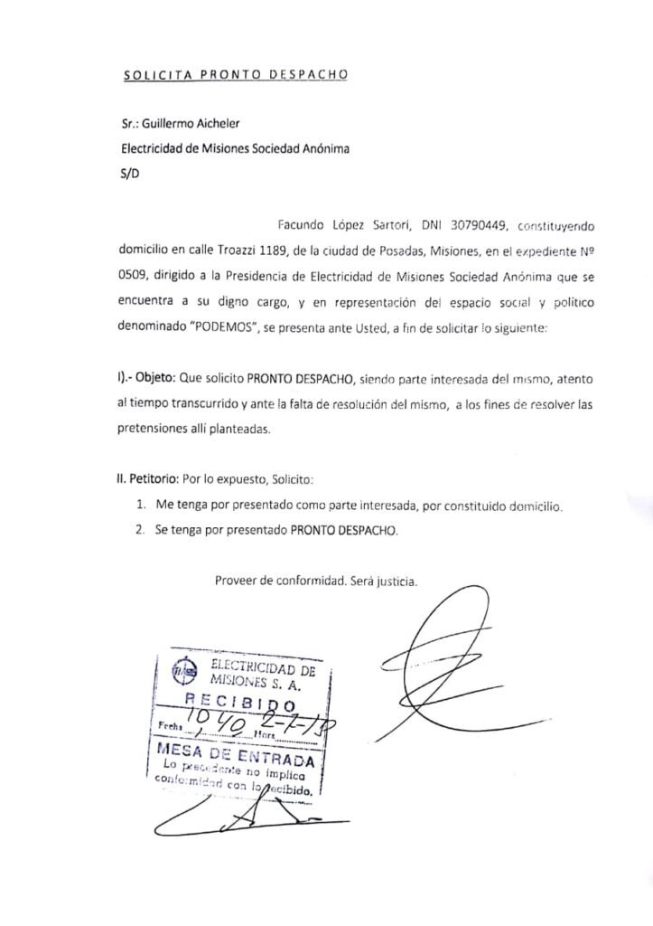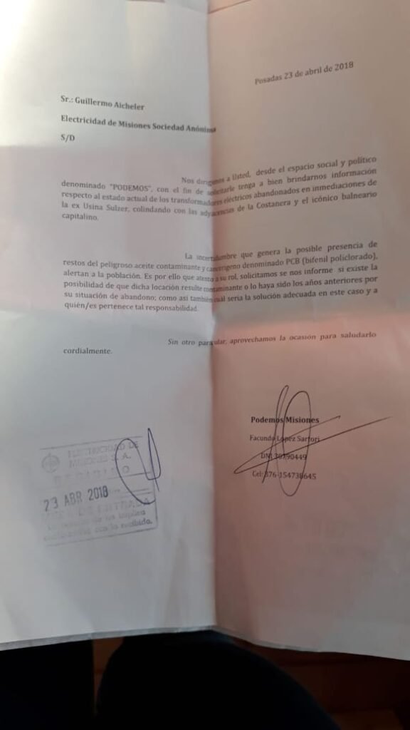 El día 23 de Abril del corriente el espacio político y social “PODEMOS”, mediante uno de sus representantes, Licenciado Facundo López Sartori, presentó las notificaciones correspondientes a EMSA (Electricidad de Misiones S.A.), al Ministerio de Ecología y a la EBY Entidad Binacional Yacyretá, solicitando información sobre el estado actual de los transformadores eléctricos que se encuentran abandonados en inmediaciones de la ex Usina Sulzer, colindando con las adyacencias de la Costanera y el icónico balneario capitalino (El Brete).