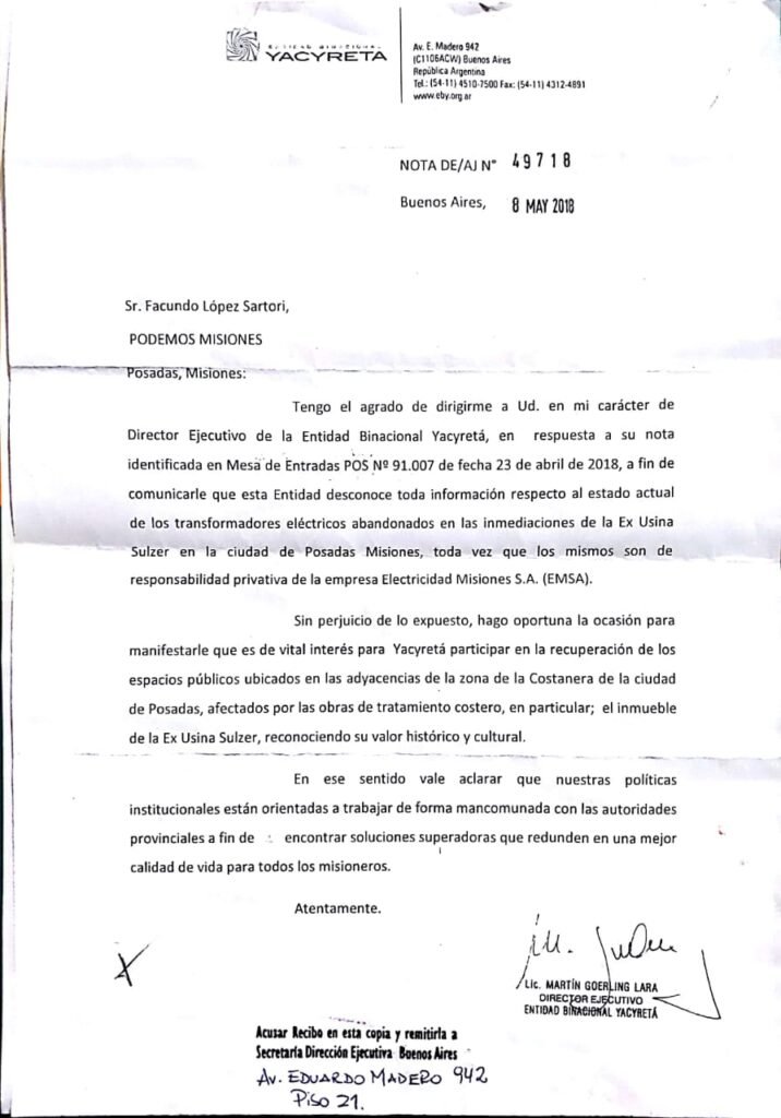 En fecha 8 de mayo, la Entidad Binacional (EBY), respondió a nuestra nota indicando que desconocen toda información respecto al estado actual de dichos transformadores, y que los mismos son de responsabilidad privativa de la empresa Electricidad de Misiones SA (EMSA). Asimismo manifestó el interés en trabajar en la recuperación de espacios públicos y en particular en el inmueble de la ex Usina Sulzer.