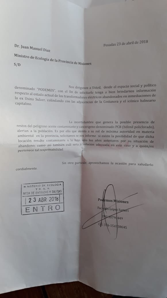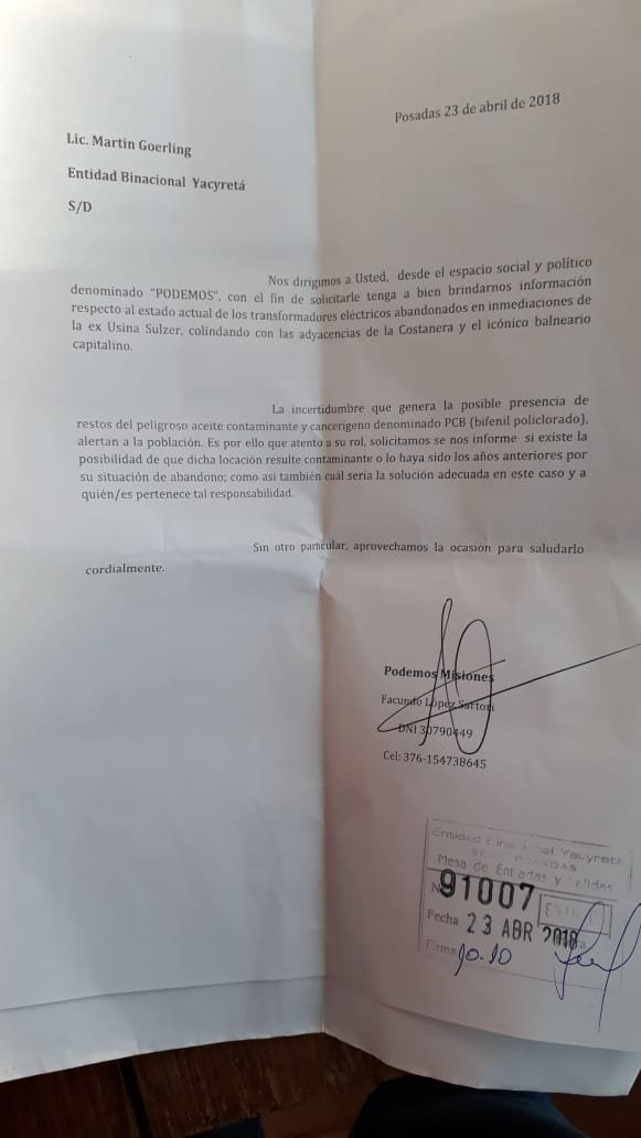 El día 23 de Abril del corriente el espacio político y social “PODEMOS”, mediante uno de sus representantes, Licenciado Facundo López Sartori, presentó las notificaciones correspondientes a EMSA (Electricidad de Misiones S.A.), al Ministerio de Ecología y a la EBY Entidad Binacional Yacyretá, solicitando información sobre el estado actual de los transformadores eléctricos que se encuentran abandonados en inmediaciones de la ex Usina Sulzer, colindando con las adyacencias de la Costanera y el icónico balneario capitalino (El Brete).