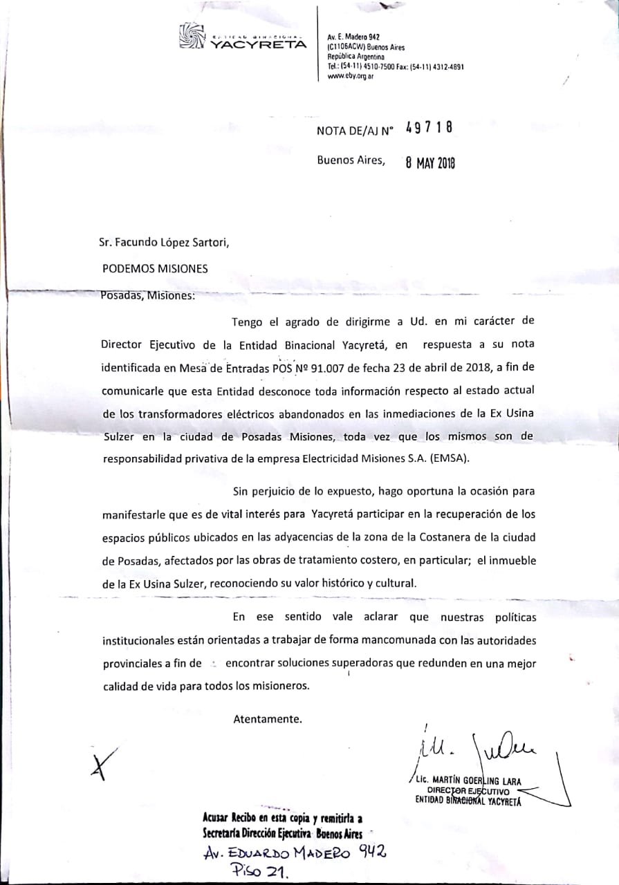 En fecha 8 de mayo, la Entidad Binacional (EBY), respondió a nuestra nota indicando que desconocen toda información respecto al estado actual de dichos transformadores, y que los mismos son de responsabilidad privativa de la empresa Electricidad de Misiones SA (EMSA). Asimismo manifestó el interés en trabajar en la recuperación de espacios públicos y en particular en el inmueble de la ex Usina Sulzer.