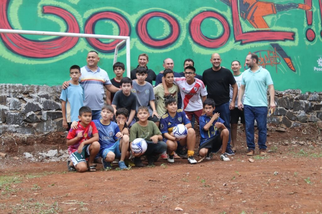 También acompañaron la entrega los titulares del proyecto Renzo Pedroski, Martín Wimmer y Arturo Barrios, junto a vecinos del lugar y decenas de niños y niñas que disfrutaban de la cancha y de los juegos del flamante espacio comunitario.