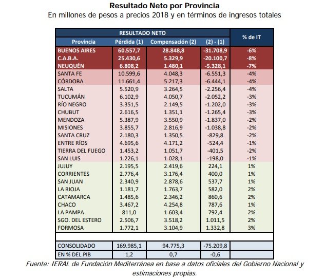 Una estimación del resultado neto por provincia en 2019 se expone en la tabla que sigue, en que puede observarse nítidamente que las dos jurisdicciones con mayores pérdidas absolutas serán la provincia de Buenos Aires y CABA, con efectos netos negativos del orden de los 31 y 20 mil millones de pesos, respectivamente, mientras que provincias como Neuquén, Santa Fe y Córdoba tendrán pérdidas netas del orden de los 5 a 7 mil millones de pesos. Por otra parte, existirán provincias que podrían obtener resultados netos positivos en 2019, como el caso de Formosa y Santiago del Estero, entre otras.