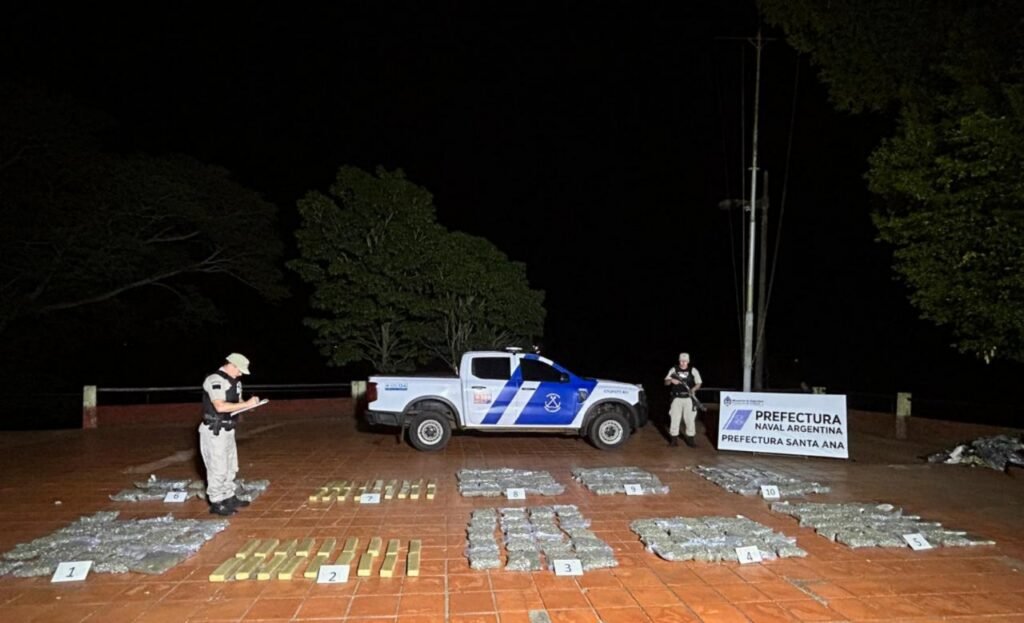 El operativo se desarrolló a partir de una investigación previa que alertaba sobre un posible traslado de droga en la zona conocida como “Cartel Mate Rojo”. En ese contexto, y mediante el uso de visores nocturnos, la Autoridad Marítima Nacional detectó el desplazamiento de varios individuos que transportaban bultos desde la costa del río Paraná, a la altura del kilómetro 1.603, hacia la Ruta Nacional N° 12.