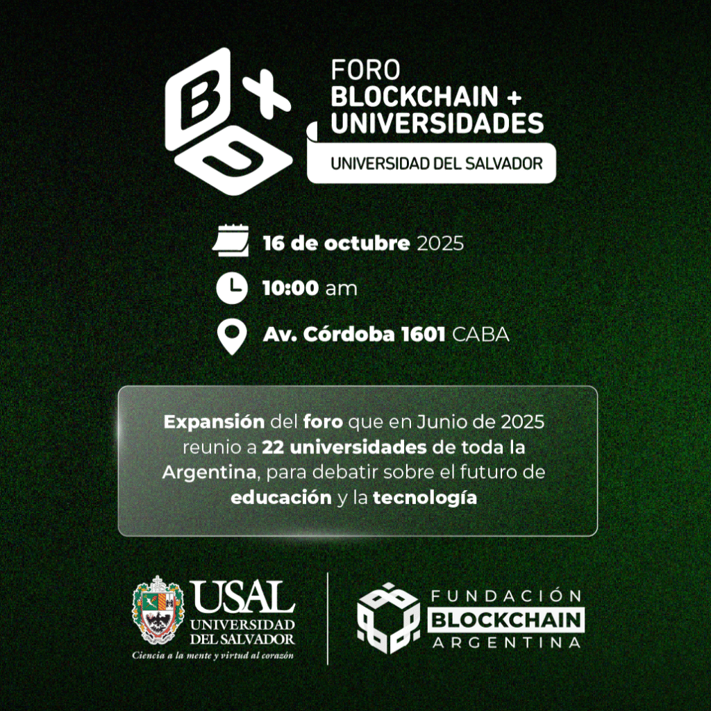 La Fundación Blockchain Argentina, con el apoyo de la Universidad del Salvador, llevará adelante el Foro Blockchain & Universidades el próximo jueves 16 de octubre a las 10 hs en Córdoba 1601, Ciudad de Buenos Aires. Se trata del segundo encuentro del ciclo universitario organizado por la Fundación, un espacio que busca acercar la tecnología blockchain y sus aplicaciones a la vida cotidiana, conectando a la comunidad académica con referentes del ecosistema.