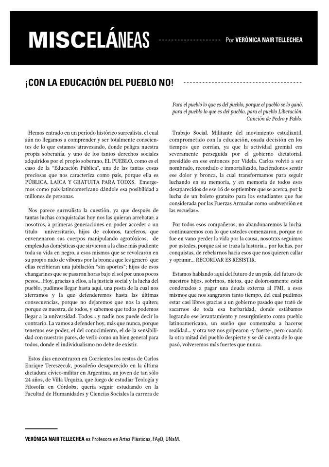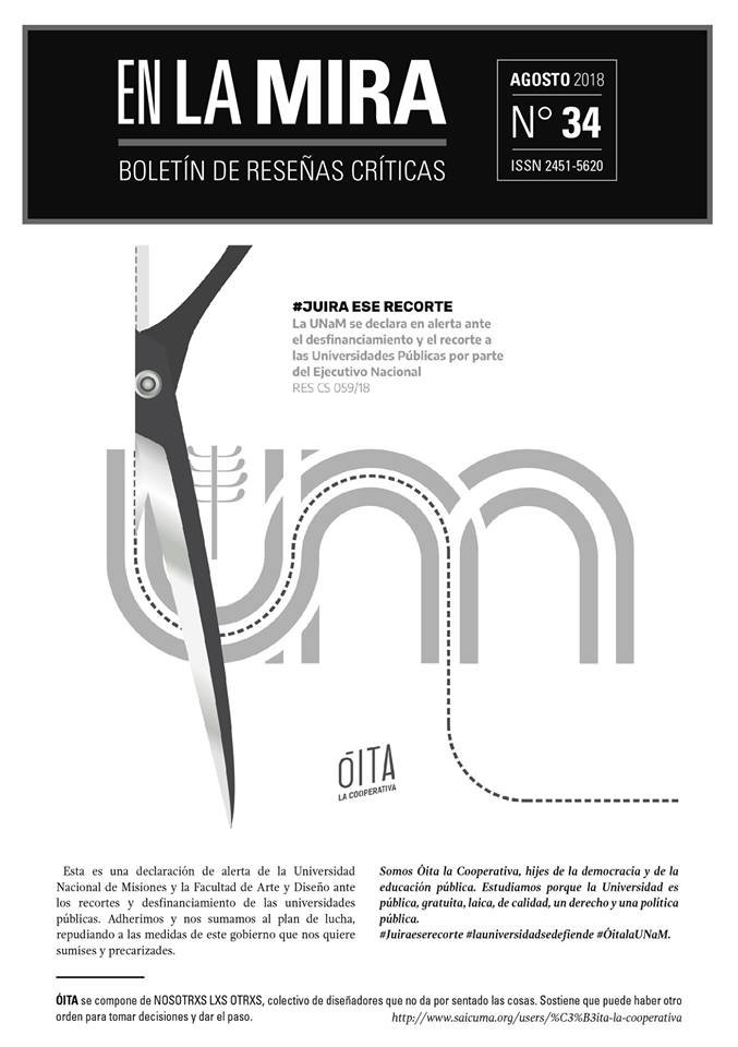 En la Mira… es un boletín de reseñas nacido en 2013, que cuenta con 35 números publicados ininterrumpidamente desde hace seis años. El boletín se divide en cuatro secciones fijas en las que podemos apreciar reseñas de arte, cine, fotografía, trabajo social, poesía, diseño y cultura en general. Originalmente institucionalizado como un proyecto de Extensión Universitaria en la Facultad de Arte y Diseño, hoy amplía la apuesta e inaugura su espacio web para el alcance de todos los lectores.