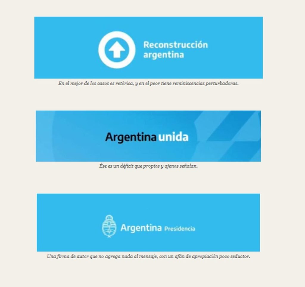 Verbitsky dijo que las 3 piezas son herencia de la gestión de Juan Pablo Biondi, exsecretario de Comunicación que fue echado por Fernández luego de que CFK lo acusara de montar “operaciones” en su contra en los medios. Sobre “Reconstrucción Argentina “, el exmilitante montonero señaló que “en el mejor de los casos es retórica, y en el peor tiene reminiscencias perturbadoras”. Respecto a otro lema, “Argentina Unida”, sostuvo que es “un déficit que propios y ajenos señalan”. Finalmente, sobre la firma “Argentina. Presidencia”, remarcó que “no agrega nada al mensaje, con un afán de apropiación poco seductor”.