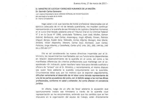 Stilman ratifica que llegó a encabezar la querella del Ministerio de Justicia por pedido de Carrió “y se me está impidiendo ejercer mi función con libertad y probidad, máxime tratándose de una causa que me genera un superlativo compromiso moral y una alta sensibilidad social ante el reclamo de los familiares de las víctimas”.