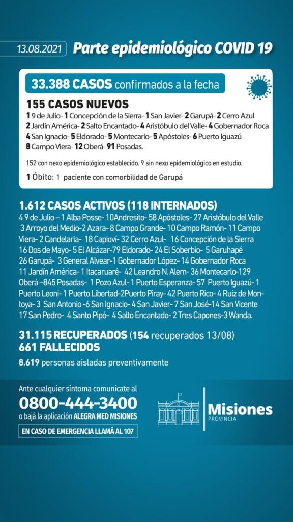 EL parte oficial del ministerio de Salud del viernes (13/08) reveló 155 contagios y el fallecimiento de una persona con Covid-19. Misiones acumula 33.388 casos y 661 muertos desde el inicio de la pandemia