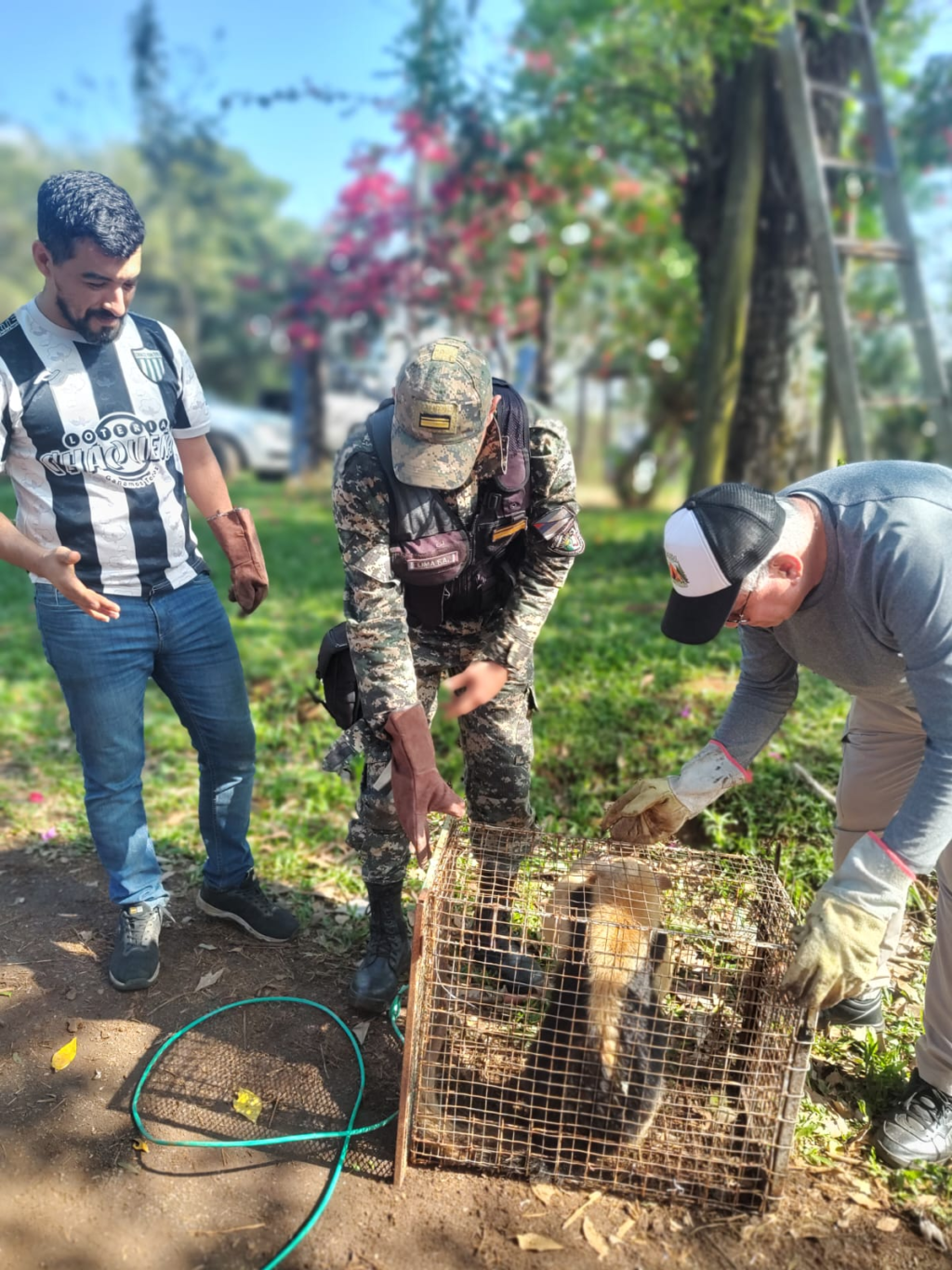 Fue así que en coordinación con la Fundación Yarará en Acción, se dirigieron al barrio Villa Bonita, de Posadas, donde constataron que efectivamente se trataba de un oso melero, que por miedo a los canes trepó a la copa de un árbol de mas de 7 metros de altura.