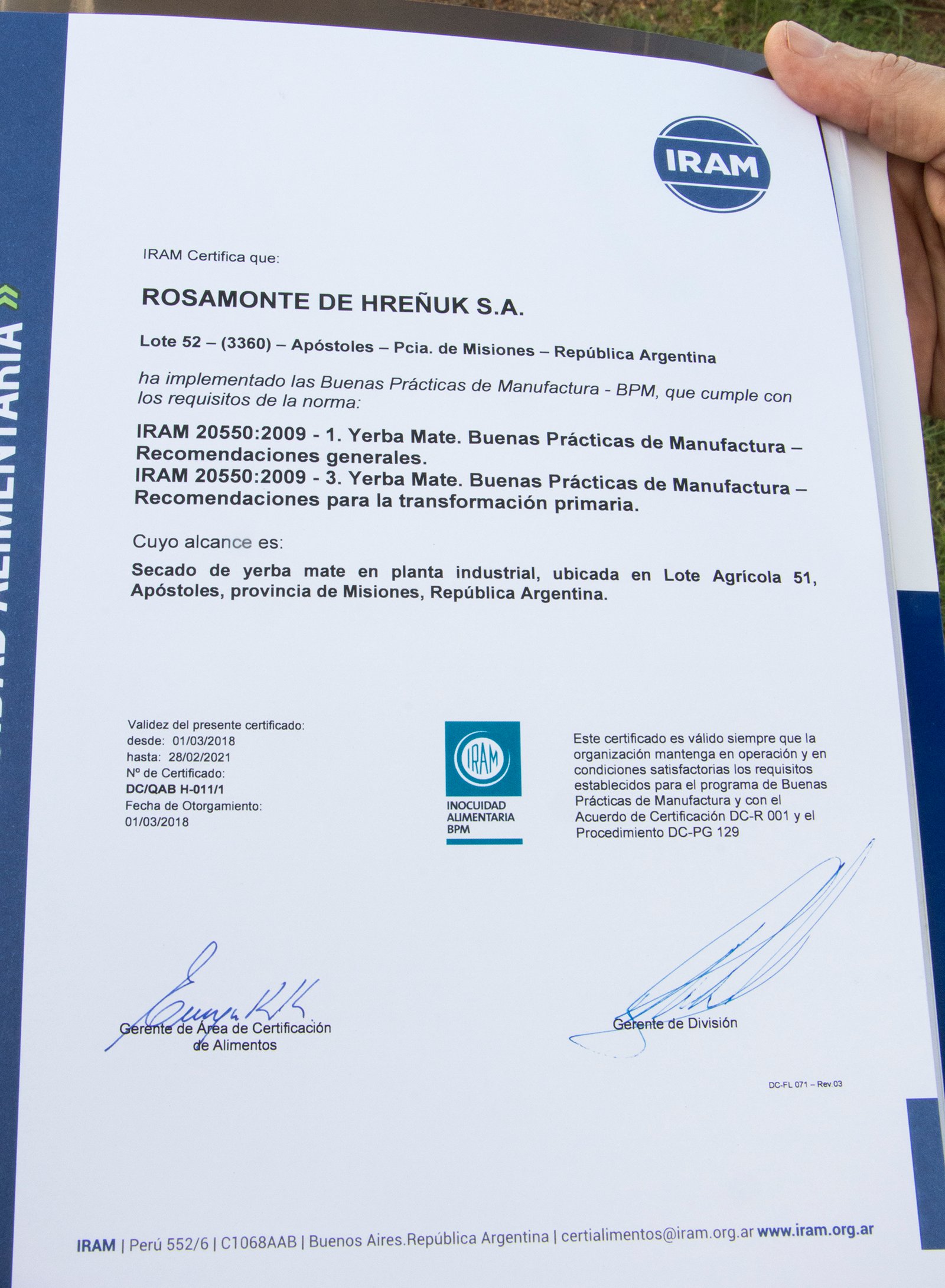 “Fueron certificados los puntos 1 y 3 de las Normas IRAM 20550; el primero abarca el cumplimiento de requisitos generales y el segundo hace referencia a la elaboración primaria, en este caso el secado y el canchado de yerba mate”, explicó el ingeniero industrial José María Zanek, encargado de Producción en la empresa radicada en la localidad de Apóstoles, en el sur de la zona productora.