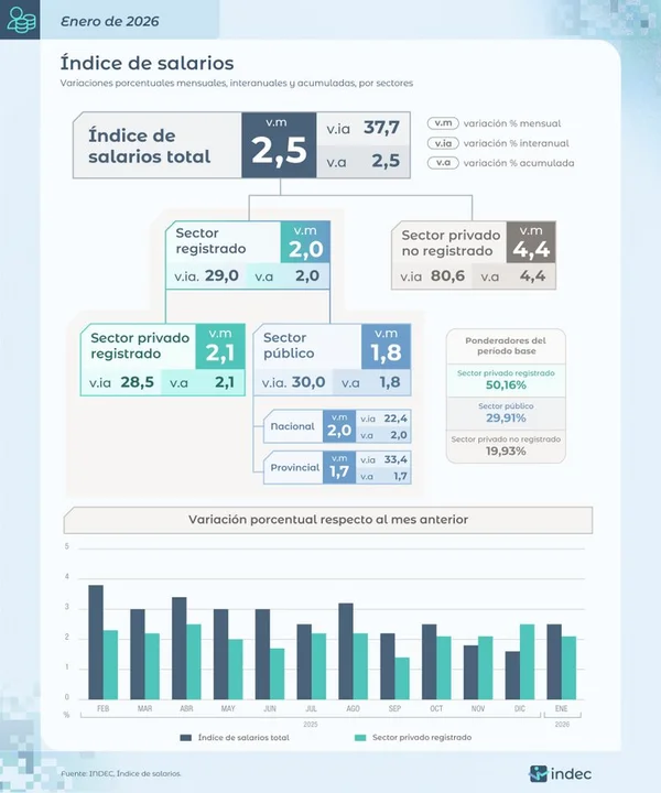 El informe muestra una estructura fragmentada. El crecimiento del 2,5% mensual se explica por subas de 2,1% en el sector privado registrado, 1,8% en el sector público y 4,4% en el sector privado no registrado .