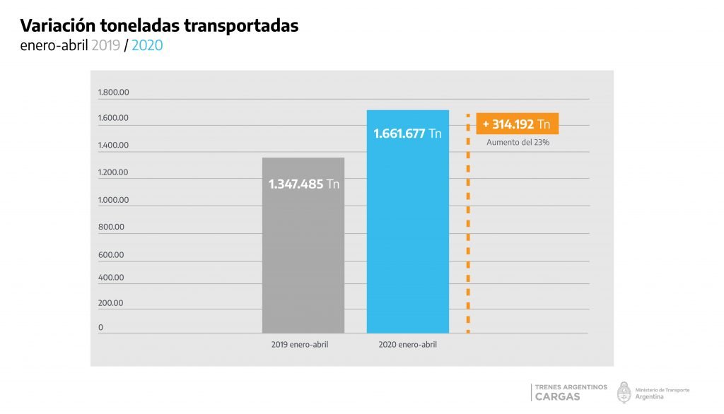 Dentro de estas cifras se destaca el mes de abril, en el que se superó por 54 mil toneladas la cantidad del 2019. Este aumento, que representa un incremento de 14%, se dió en el marco de la decisión presidencial de declarar al transporte ferroviario de cargas como actividad esencial dentro del aislamiento social, preventivo y obligatorio por la propagación del COVID-19.
