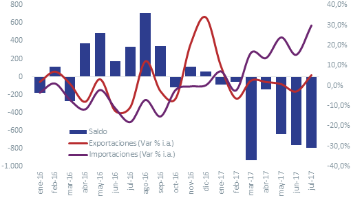 Como consecuencia del fuerte crecimiento de las importaciones y el magro desempeño de las ventas al exterior el déficit comercial de Argentina fue de USD 798 millones en Julio. Cuando analizamos el acumulado del año vemos que en los primeros 7 meses las importaciones crecieron un 29,9%% y las exportaciones un 1,4%, lo que arroja un déficit en la balanza comercial de USD 3428 millones, evidenciándose el deterioro con respecto al mismo período de 2016 en el cual el resultado fue superavitario (+ USD 1020 millones).