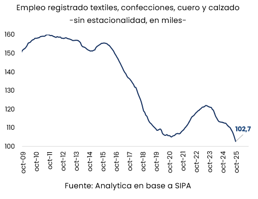La contracara de esta noticia positiva para los consumidores es la pérdida de puestos de trabajo: desde noviembre de 2023 hasta octubre pasado, último dato disponible, se perdieron 18.333 puestos de trabajo registrados en el sector de textiles, confecciones, cuero y calzado, una caída del 15,1%, siendo el mínimo para toda la serie que inicia en 2009. Y sin considerar que el sector tiene tasas de informalidad muy elevadas, en especial en el segmento de confecciones, en torno al 72%.