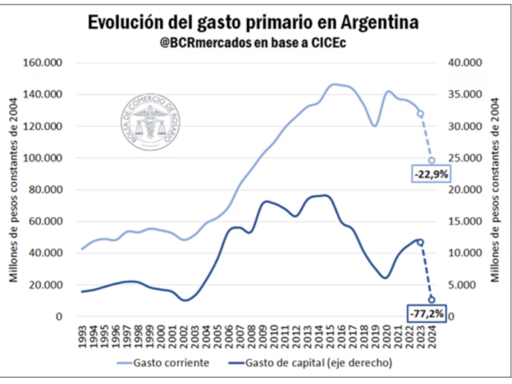 Con ese dato como punto de partida, la Bolsa de Comercio de Rosario (BCR) elaboró un informe explicando el escenario condujo a esa situación. En ese contexto, destacaron que la asunción de un nuevo gobierno en diciembre de 2023 marcó un abrupto cambio en la política económica de Argentina. “Con el foco puesto en detener la emisión monetaria para combatir la inflación, que llegó a situarse en más del 25% mensual en diciembre de aquel año, comenzó un proceso de saneamiento de las cuentas públicas para lograr el equilibro fiscal”, señalaron.