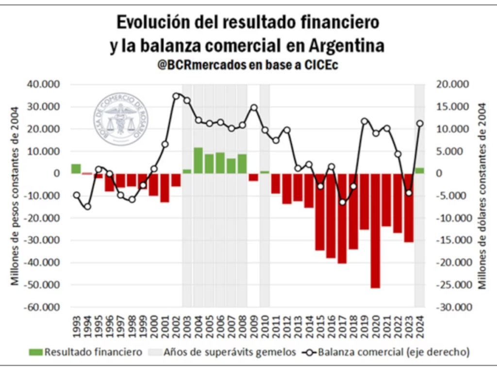 Según datos recopilados por el Centro de Investigación del Ciclo Económico (CICEc), en 2024 Argentina alcanzó superávits gemelos por primera vez en 14 años. En términos históricos, la última vez que nuestro país registró la combinación de un resultado financiero positivo junto con una balanza comercial superavitaria fue en 2010, y este hecho únicamente se observó en 8 de los últimos 31 años.