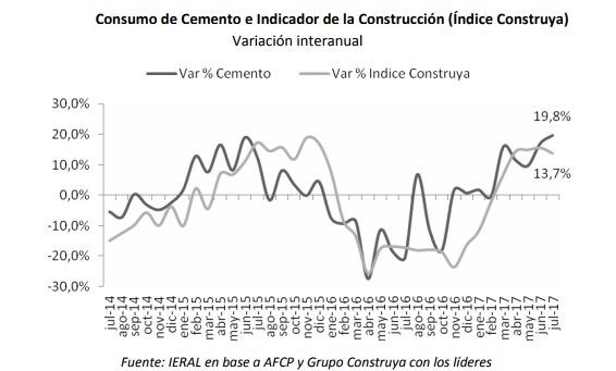 En el mes de julio de 2017, el consumo total de cemento a nivel nacional, según datos presentados por la Asociación de Fabricantes de Cemento Portland (AFCP), alcanzó las 1.016.589 toneladas (+19,8% interanual), acumulando un total de 6.535.505 en los primeros siete meses del año (+10,9% interanual). Este indicador, se encuentra respaldado por el comportamiento del Índice Construya 1 , elaborado por el Grupo Construya con los líderes, con el cual guarda una correlación positiva. Por provincias, permanecen en terreno negativo en la variación interanual, para los primeros siete meses, La Pampa, con – 15,3 %, Tierra del Fuego (-13,1 %), Santa Cruz (-12,6 %), Misiones (-4,4 %), San Juan (-3,1 %) y Jujuy (- 2,9 %)