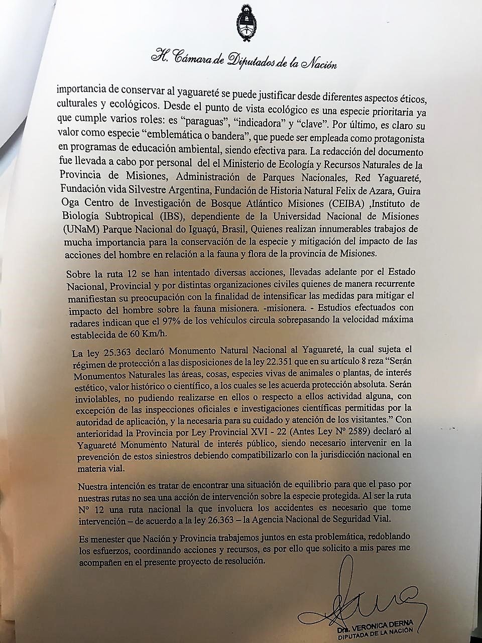 En el escrito dirigido al Presidente de la Nación, Derna detalla que la prevención en materia vial en Misiones no sólo apunta a proteger vidas humanas sino que también busca cuidar la de los animales. En la provincia tres mil mueren atropellados por año en la zona norte debido al exceso de velocidad. Algunas de las víctima pertenecen a especies en peligros de extinción, como el caso del Yaguareté. Entre el 2012 y el 2018, cuatro ejemplares fueron atropellados. En el último caso ocurrido hace semanas murió una hembra preñada de dos crías.