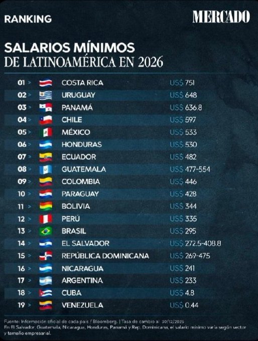 El deterioro también se refleja en la comparación regional. Según un ranking de salarios mínimos de América Latina elaborado con información oficial de cada país y compilado por Bloomberg con tipo de cambio al 30 de marzo de 2026, Argentina aparece en el puesto 17 de 19 países relevados.