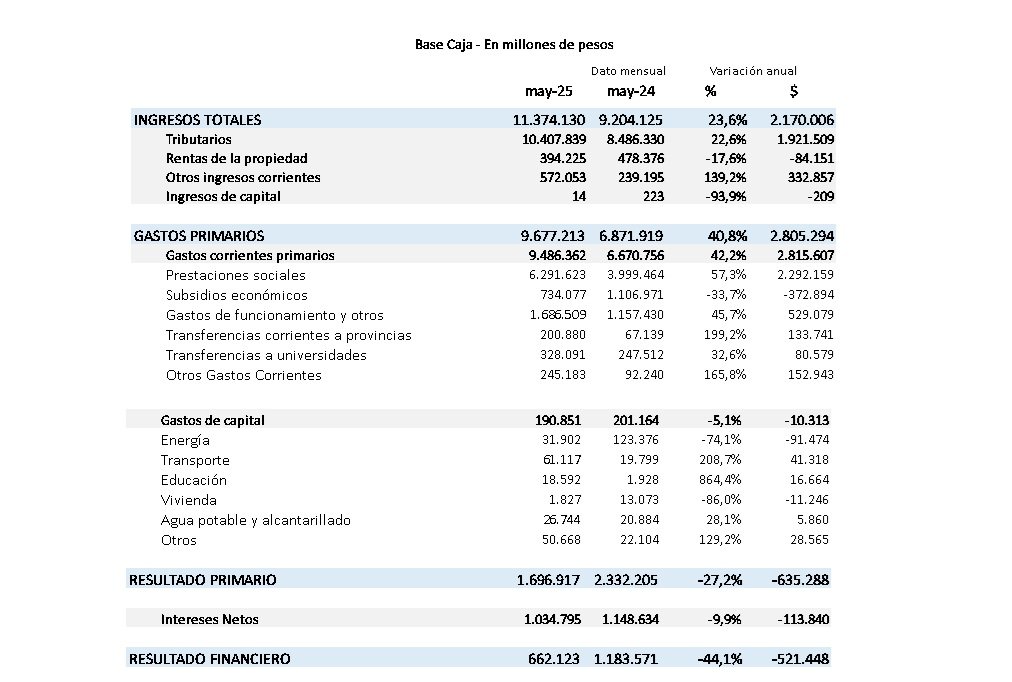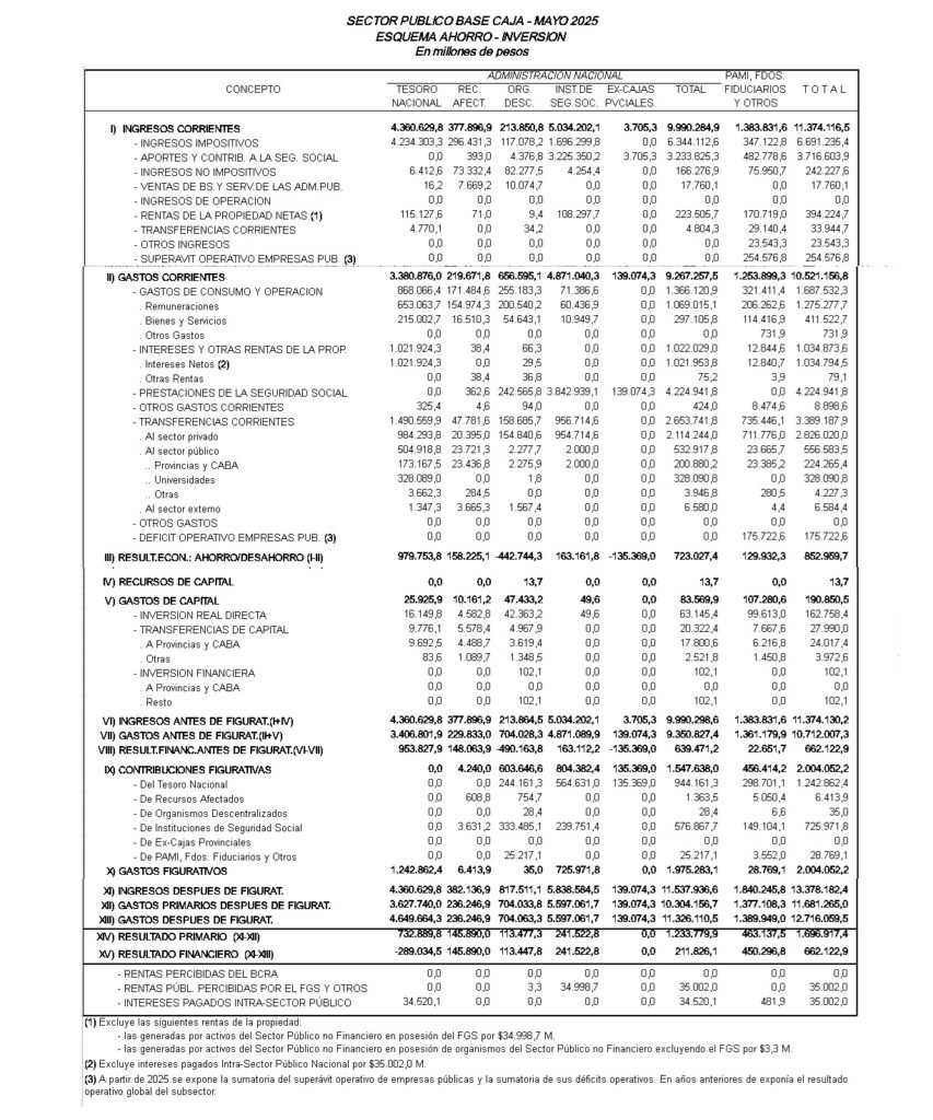 Con estos datos, el Gobierno acumula en los primeros cinco meses del año un superávit primario del 0,8% del PBI y un superávit financiero del 0,3%, en línea con el ajuste fiscal que sostiene la gestión libertaria desde diciembre de 2023.