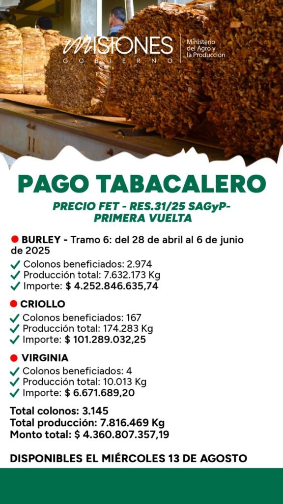 La Secretaría de Agricultura anunció que el miércoles 13 de agosto se acreditará la primera vuelta del precio FET correspondiente al tramo 6 de la campaña 2025, beneficiando a más de 3.100 productores de Burley, Criollo y Virginia.