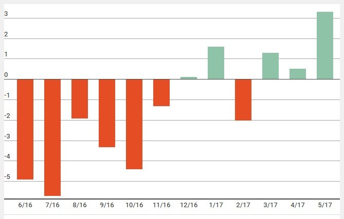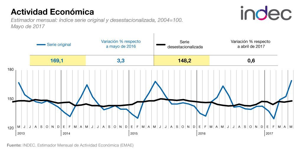 La actividad económica mostró un crecimiento del 3,3% en mayo, con relación a igual mes de 2016,debido al impulso del sector agrícola, la construcción y la industria, que había estado 15 meses en baja, informó hoy el Instituto Nacional de Estadística y Censos (Indec). Se trata de la mejor marca de la economía desde desde noviembre del 2015.