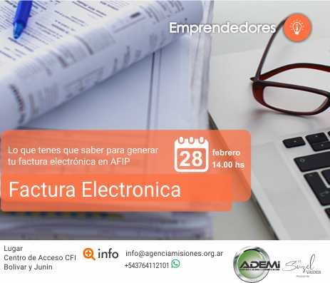 El jueves 28 de febrero, de 14 a 17, en el Centro de Acceso del Consejo Federal de Inversiones (CFI), ubicado en Bolívar y Junín; la Agencia para el Desarrollo Económico de Misiones (ADEMI) brindará una charla sobre “Lo que tenés que saber para generar tu factura electrónica”. La inscripción es gratuita y sujeta a la capacidad de la sala.