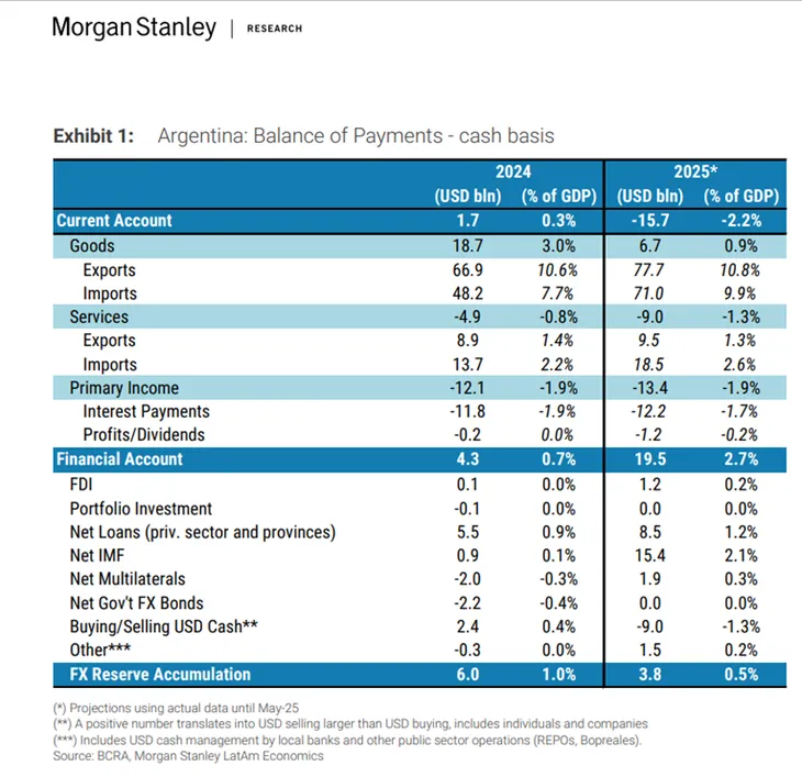En un nuevo informe de seguimiento macroeconómico, Morgan Stanley calificó como “manejable” el déficit proyectado para la cuenta corriente de la balanza de pagos de Argentina en 2025. La entidad estimó que ese desequilibrio alcanzará 2,2% del Producto Interno Bruto (PIB), pero que será compensado por un superávit en la cuenta financiera del 2,7% del PIB, lo que permitiría incluso sumar reservas al Banco Central.