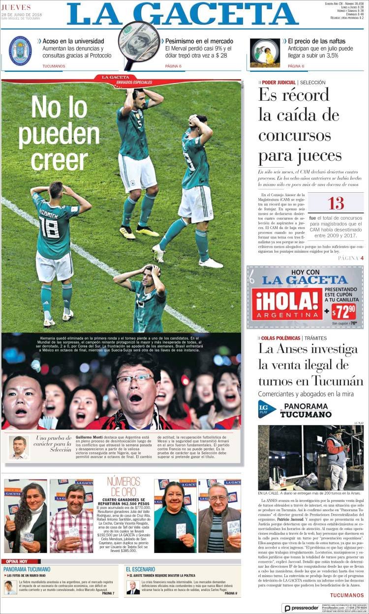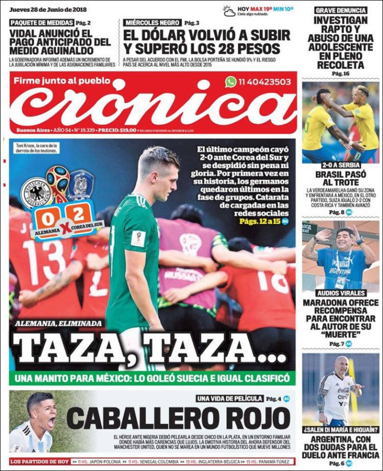 Rápidamente Alemania se despidió del Mundial de Rusia. Cayó en el Arena Kazán ante la eliminada Corea del Sur en tiempo adicionado por 2-0 y dejó la copa del mundo acéfalo. Los goles lo marcaron Kim Young-Gwon y Son Heungmin. De los últimos cinco mundiales, en cuatro, los campeones se despidieron en la fase de grupos.
