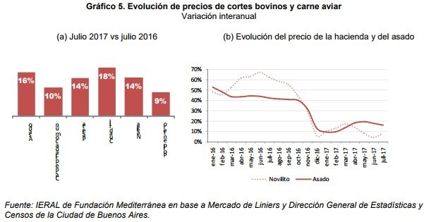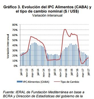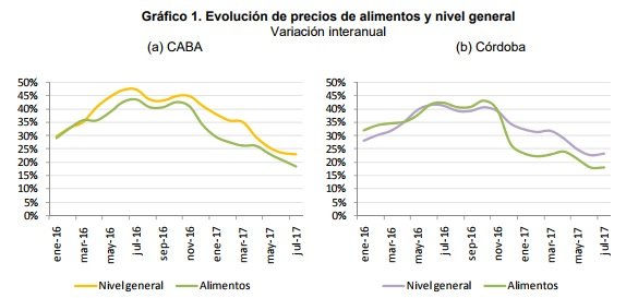 En los últimos 12 meses los precios de los alimentos han aumentado un 18%, tanto en el relevamiento que hace el gobierno de la Ciudad de Buenos Aires (IPC CABA) como el que realiza el gobierno de la provincia de Córdoba (IPC CBA). Otra coincidencia es que, en ambas jurisdicciones, la inflación en alimentos se encuentra 5 puntos por debajo de la inflación general (23%). A julio de 2016 los precios de los alimentos crecían a una tasa del 42%/43% interanual, por lo que la desaceleración se acerca a los 25 puntos porcentuales.