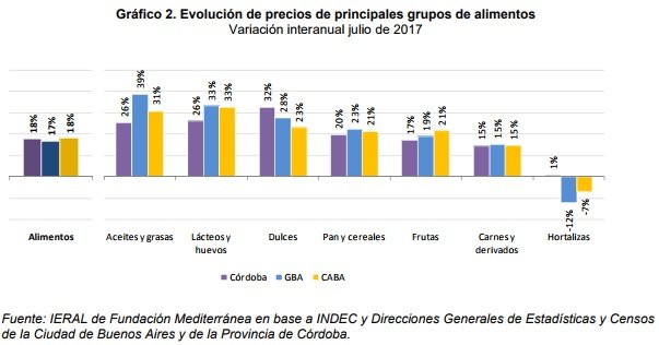 Al analizar lo sucedido con las principales aperturas (GBA, CABA y Córdoba), se observa que hay grupos de productos cuyos precios han subido por encima de la media y otros por debajo. Los que han ido por arriba son los siguientes (inflación 12 meses, a julio de 2017):