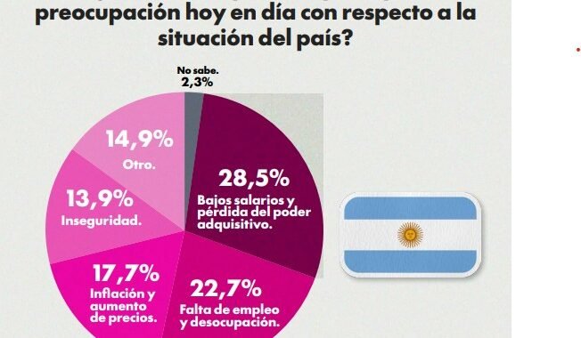 El dato más contundente es también el más político: la principal preocupación es el bolsillo, pero no en abstracto, sino en una forma concreta y cotidiana: “bajos salarios y pérdida del poder adquisitivo”, que encabeza el ranking con 28,5%. Le siguen “falta de empleo y desocupación” (22,7%), “inflación y aumento de precios” (17,7%) e “inseguridad” (13,9%). Mucho más atrás aparecen “corrupción del Estado” (7,3%), “endeudamiento del país” (5,7%) y “polarización política” (1,9%).