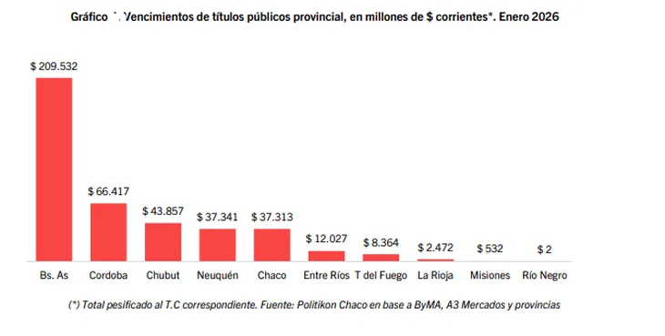 Según el informe de Politikon Chaco, Buenos Aires explicó el 74% del total emitido en enero, con colocaciones por $267.156 millones. Ese monto surgió de la emisión de tres Letras del Tesoro, todas a descuento. Chaco, en tanto, representó el 26% restante del mes, con $94.418 millones, correspondientes a un bono en pesos ajustado por TAMAR con margen y tres reaperturas de Letras de Tesorería.