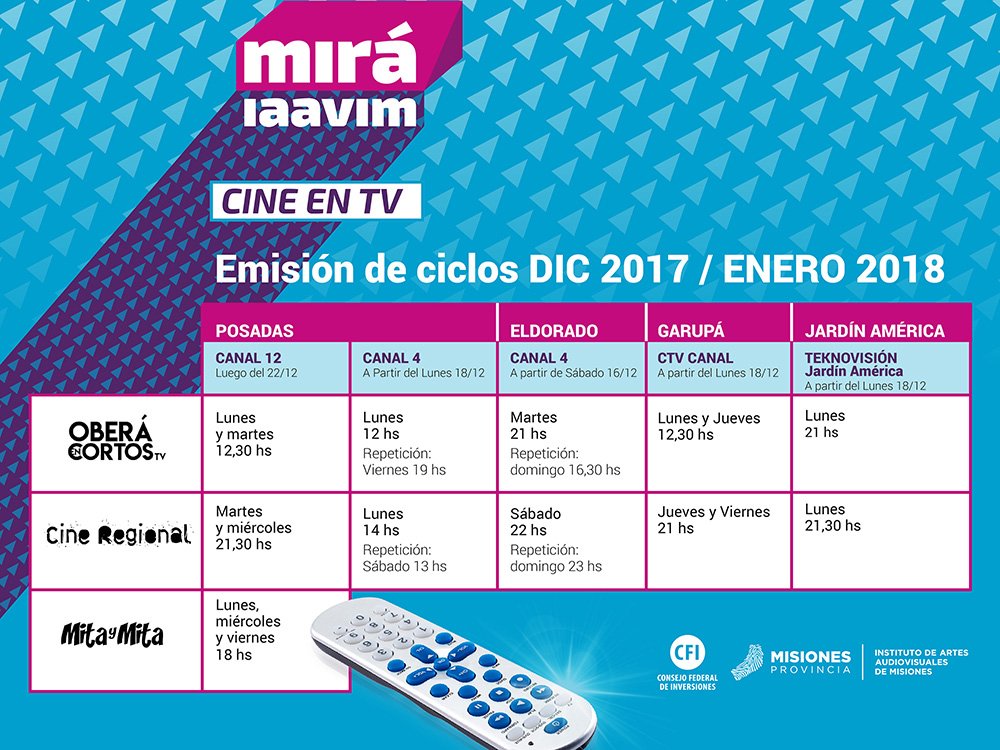 A partir de hoy, todos los sábados y domingos por Canal 4 de Eldorado (22 y 23 hs); desde el lunes 18 de diciembre, por Canal 4 de Posadas, los lunes a las 14 hs (repetición los sábados a las 13 hs); por CTV de Candelaria, los jueves y viernes a las 21 hs, y por Teknovisión de Jardín América, los lunes a las 21.30 hs. En Canal 12 de Posadas, el programa Cine Regional se emitirá luego del 22 de diciembre, los días martes y miércoles, a las 21.30 hs.