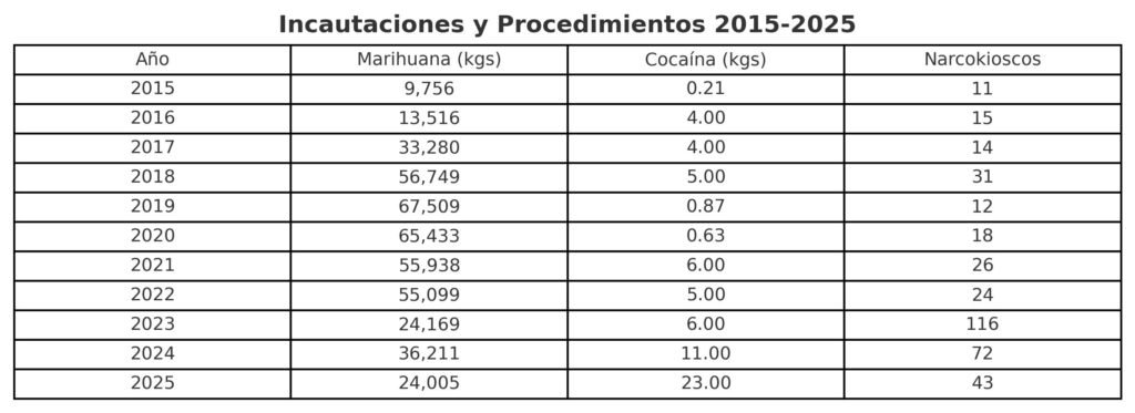Los principales resultados muestran un aumento del 35% en las incautaciones de marihuana, un crecimiento del 5% en drogas sintéticas, y la consolidación de estrategias operativas focalizadas. La ministra puntualizó que más del 80% de los operativos de secuestro de drogas fueron ejecutados por fuerzas federales, con epicentro en territorios críticos como el conurbano bonaerense, Rosario y el norte fronterizo.