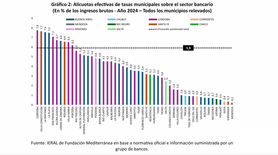 El estudio determinó que la alícuota efectiva promedio de estas tasas alcanza el 5,9% de los ingresos brutos bancarios, y en varias ciudades importantes ese valor supera el 7%, configurando una carga que “excede los límites legales de una tasa” y actúa, en la práctica, como un impuesto encubierto.