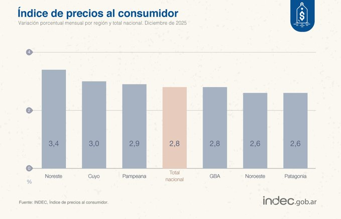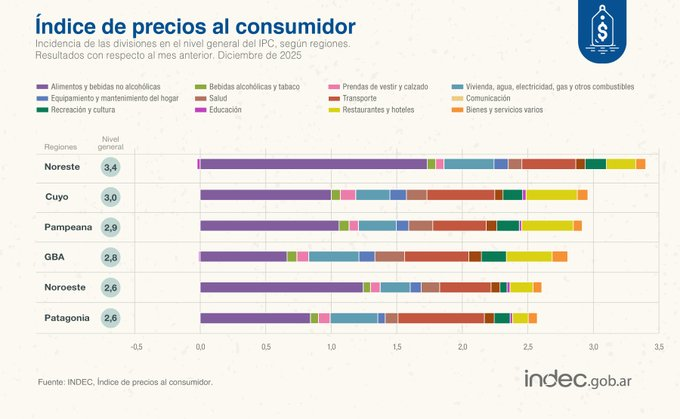 El informe del INDEC también evidenció diferencias regionales significativas. En diciembre de 2025, la región Noreste registró la mayor suba mensual del IPC, con un 3,4%, mientras que Noroeste y Patagonia presentaron los incrementos más bajos, ambos con 2,6%.