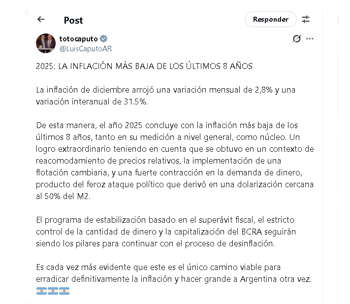 Con el cierre de diciembre, el IPC acumuló en 2025 un aumento del 31,5% interanual, un nivel que el Gobierno nacional destacó como el más bajo de los últimos ocho años. El ministro de Economía, Luis Caputo, afirmó que se trata de “la inflación más baja de los últimos 8 años, tanto en su medición a nivel general, como núcleo”.