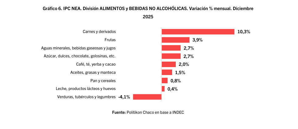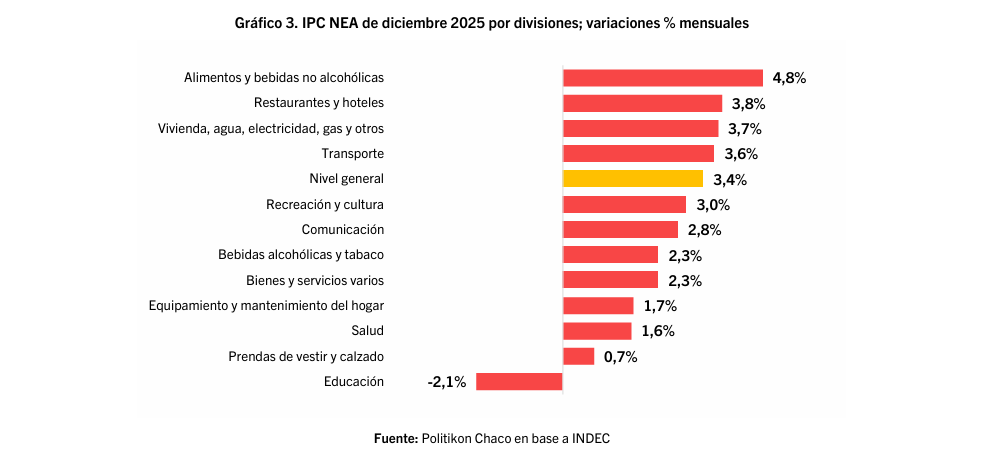 En el análisis de la comparación interanual, la división de Educación cerró el 2025 con la mayor suba en el NEA (67,7%) seguida por Restaurantes y Hoteles (44,7%) y Vivienda, Agua, Electricidad, Gas y otros (36,5%); en el extremo opuesto, Equipamiento y mantenimiento del hogar (12,7%) tuvo la menor suba en el año.