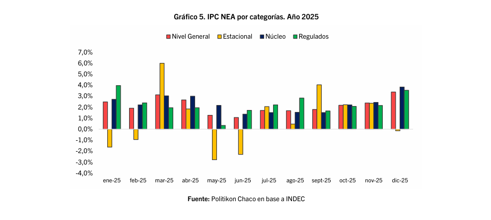 En diciembre, los precios Núcleo registraron una importante aceleración en la región: pasó de 2,4% en noviembre a 3,8%; algo similar se observó para los precios Regulados, que pasaron del 2,2% al 3,5%; en cambio, los Estacionales mostraron un comportamiento opuesto y registraron una leve caída de precios (-0,1%) que no logró compensar las fuertes subas de las otras dos categorías. En el acumulado del año 2025, los precios Núcleo fueron los más crecieron en el NEA: 31,3% frente a 30,3% de los Regulados, ambos por encima del nivel general regional (28,8%), mientras que los Estacionales se incrementaron a una velocidad muy inferior (11,4% anual).