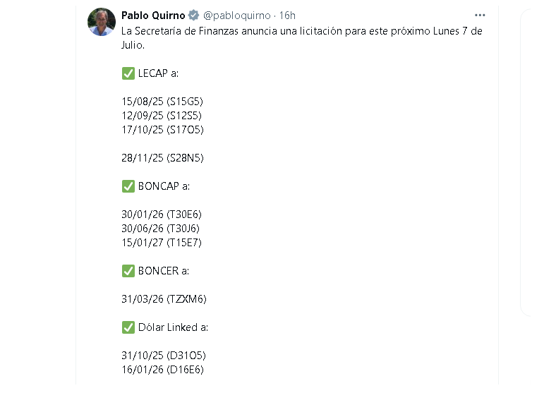 En paralelo, se amplían emisiones de letras y bonos capitalizables en pesos con vencimientos en agosto, septiembre y octubre de 2025. En conjunto, estos títulos podrán alcanzar un valor nominal original de hasta 12 billones de pesos para cubrir la demanda en la licitación prevista para el 7 de julio.
