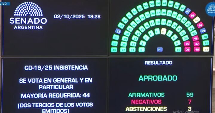 Tal como se esperaba, la norma superó los dos tercios de los votos que requería. El tablero marcó 59 votos a favor, 7 en contra y 3 abstenciones. Tras este resultado, el artículo 83 de la Constitución Nacional señala que el Poder Ejecutivo debe directamente promulgarla.